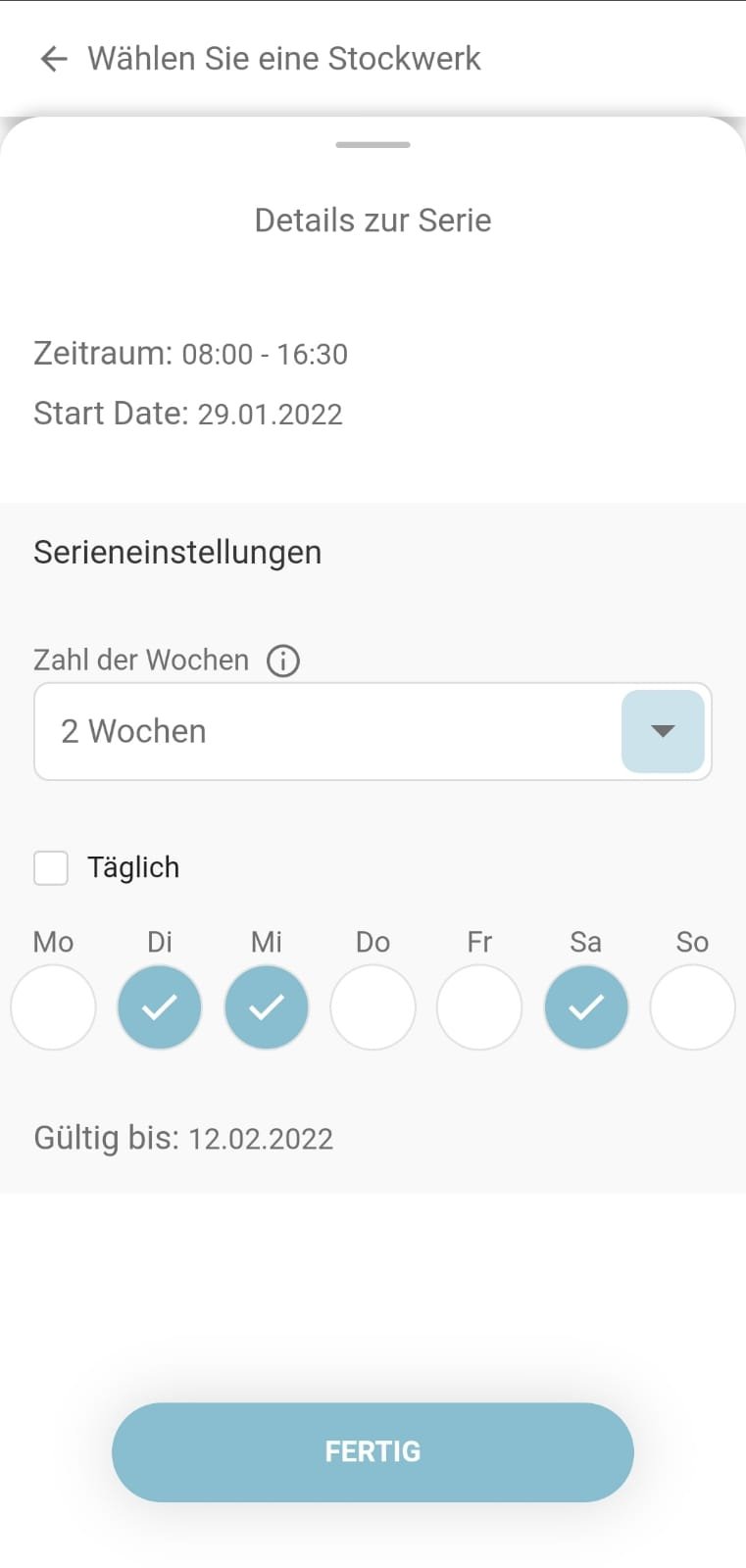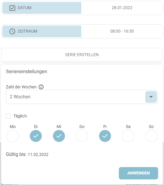 Nach der Auswahl des Zeitintervalls hat die/der Benutzer*in die Möglichkeit, die Einstellungen für eine Check-In-Serie vorzubereiten und einen Platz für mehrere Tage oder sogar einen Monat in der Zukunft zu buchen. Durch Drücken des Serie Erstellen-Buttons* öffnet sich ein Popup. Darin kann die/der Benutzerin die Anzahl der Wochen für die Wiederholung auswählen, die von der/vom Gebäudeadministratorin festgelegten Datumsversatz abhängt (Standard ist eine Woche und das Maximum sind 4 Wochen), und die Wochentage auswählen, an denen er die Prüfung erstellen möchte -ins. Die/Der Benutzer_in kann auch das Datum sehen, bis zu dem die Wiederholung gültig ist. Nachdem Sie auf die Schaltfläche _Anwenden geklickt haben, enthält das Feld Wiederholen den Wiederholungszeitraum und einen Papierkorb, der es der/dem Benutzer*in ermöglicht, die Wiederholungseinstellungen zu löschen. Die wiederkehrende Check-In-Serie kann nur für einzelne Check-Ins erstellt werden.