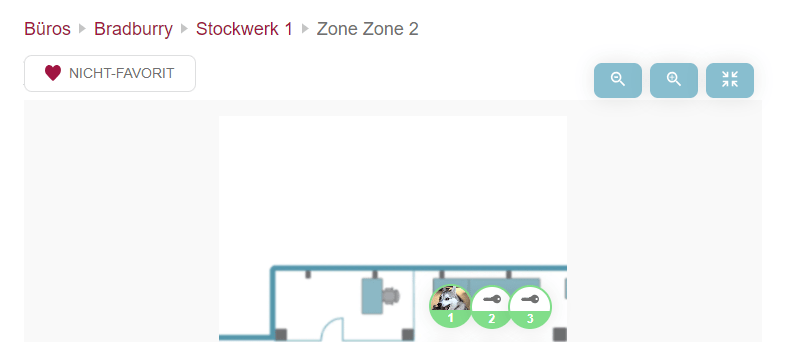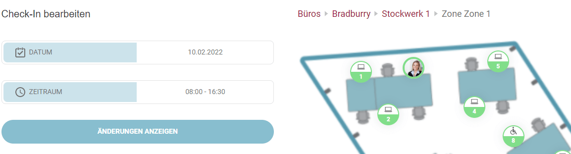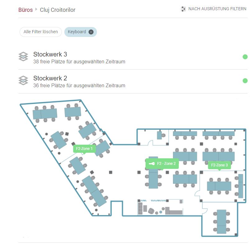 Nach der Auswahl eines Gebäudes, einer Etage und eines Bereichs kann die/der Benutzer*in auf die Pins klicken, um einen bestimmten Platz auszuwählen. In einem Bürogebäude gibt es drei Arten von Plätzen: normaler Arbeitsplatz im Büro (Laptop-Symbol), Platz in der Cafeteria (Kaffeetassen-Symbol) und Platz im Aufenthaltsraum (Spiele-Symbol). Ein Arbeitsplatz kann gesperrt sein (Schlüsselsymbol), was bedeutet, dass er sich in einem Bereich oder Büro befindet, zu dem eine spezielle Berechtigung erforderlich ist. Außerdem gibt es Orte, die für Menschen mit Behinderungen bestimmt sind (Rollstuhlsymbol).