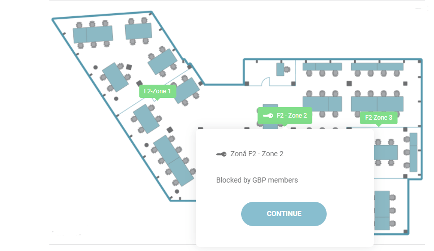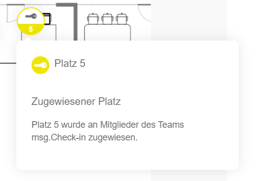Zusätzlich kann eine Zone einem bestimmten Team zugewiesen werden. Die dem Team zugeordneten Plätze innerhalb dieser Zone sind ebenfalls mit einem Schlüsselsymbol gekennzeichnet. Wenn ein Benutzer Mitglied des zugewiesenen Teams ist, kann er einen der zugeteilten Plätze auswählen und mit dem Check-in-Prozess fortfahren. Wenn der Benutzer jedoch nicht Teil des Teams ist, erscheint nach dem Anklicken eines Platzes eine Popup-Meldung, die besagt, dass der Platz bereits dem Team "Name" zugewiesen ist, wie unten dargestellt: