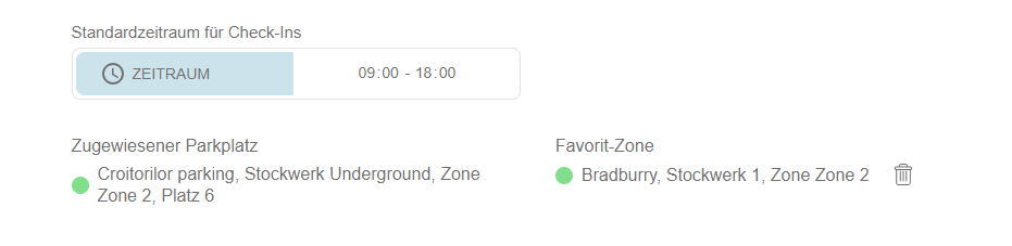 Während des Check-in-Prozesses, im Kartenansicht eines bestimmten Bereichs, haben Sie die Möglichkeit, diesen als Favorit zu kennzeichnen. Durch die Auswahl einer Zone als Favorit vereinfachen Sie das Check-in-Prozess, da Sie automatisch zu dieser spezifischen Zone geleitet werden und die Notwendigkeit entfällt, während des Check-in-Prozesses manuell das Gebäude, die Etage und die Zone auszuwählen. Die festgelegte Favoritenzone wird auch bequem im Abschnitt "Profil verwalten" angezeigt. Um eine Favoritenzone zu entfernen, können Sie entweder die dafür vorgesehene Schaltfläche in der Kartenansicht verwenden "Nicht Favorit" oder das "Mülleimer"-Symbol im Abschnitt "Profil verwalten" nutzen.