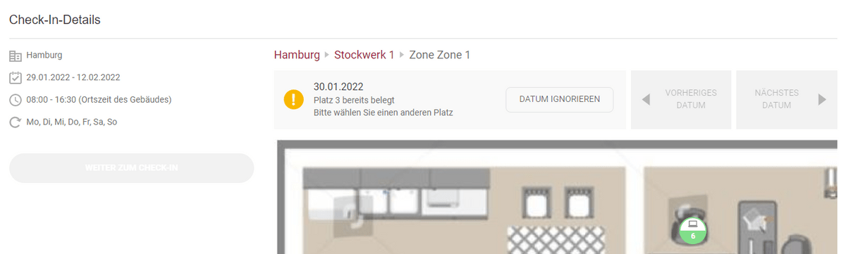 Wenn die/der Nutzerin einen Arbeitsplatz auswählt, kann sie/er die dort vorhandene Ausstattung einsehen. Wenn der gewählte Arbeitsplatz gesperrt ist, kann die/der Nutzerin auch den Grund sehen, warum die/der Gebäudeverwalterin sie/ihn als gesperrt markiert hat. Sobald die/der Benutzer_in entschieden hat, an welchem Ort auf der Karte er einchecken möchte, kann er diesen Ort schließlich auswählen und auf die Schaltfläche _Weiter zum Check-In klicken.