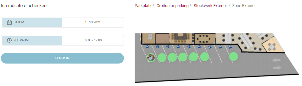 Ein zusätzliches Feature ist der Parking Check-In. Diese Funktion ist verfügbar, wenn Ihr/e Administratorin sie aktiviert. Der Ablauf der Parkplatzbuchung ähnelt dem Check-In-Ablauf und folgt denselben Regeln. Ein Unterschied besteht darin, dass die Team-Check-in-Option für den Parkplatz-Check-in nicht verfügbar ist. Falls der Benutzer die Rolle Rezeptionsadministrator hat, kann er/sie auch mit der Erstellung von Parkplatz-Check-ins fortfahren. Der Rezeptionsadministrator kann die als "Gast"-Plätze gekennzeichneten Sonderparkplätze nutzen, um Parkplatz-Check-Ins für die Externen zu erstellen, oder er/sie kann die normalen Parkplätze nutzen, die allen Mitarbeitern zur Verfügung stehen. Mitarbeiter können nur die normalen Parkplätze buchen, die Gäste können jedoch auf beiden Arten von Parkplätzen eingecheckt werden.