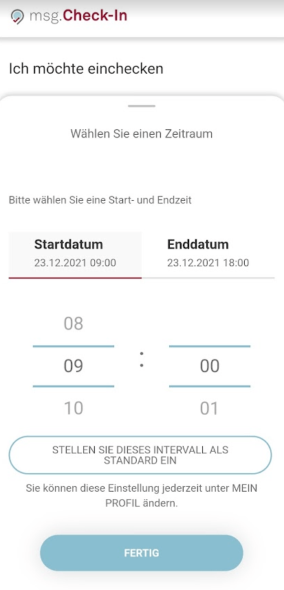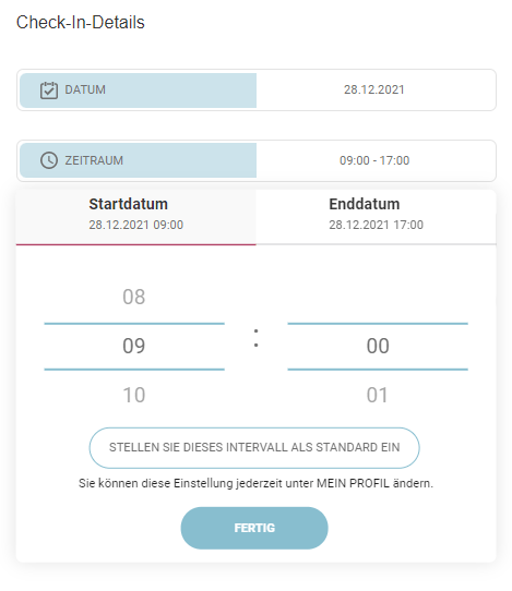 Nach diesem Schritt landet die/der Benutzerin auf einem Bildschirm, auf dem sie/er die Details für den Check-In festlegen kann. Um einen Check-In zu erstellen, wählt die/der Benutzerin den gewünschten Tag aus dem Kalender aus. Anschließend kann die/der Benutzerin entweder für den ganzen Arbeitstag (8 Stunden) oder für ein spezifisches Zeitintervall einchecken. Die/Der Benutzerin hat die Möglichkeit, die Startzeit und die Endzeit des Check-Ins durch Drücken der Schaltfläche Zeitraum auszuwählen. Um die gewünschte Uhrzeit auszuwählen, muss die/der Benutzerin den Stunden- und Minutenfenstern nach oben und unten scrollen (auf dem Desktop kann er auch auf die gewünschte Stunde/Minute klicken). Wenn die/der Benutzerin eine Uhrzeit für den nächsten Tag wählt, wird das Enddatum automatisch aktualisiert. Das gewählte Zeitintervall kann eine Mindestdauer von 1 Minute und eine Höchstdauer von 24 Stunden haben.