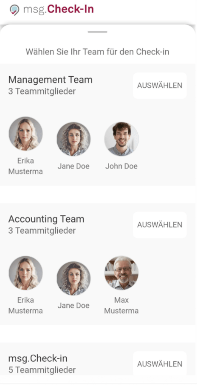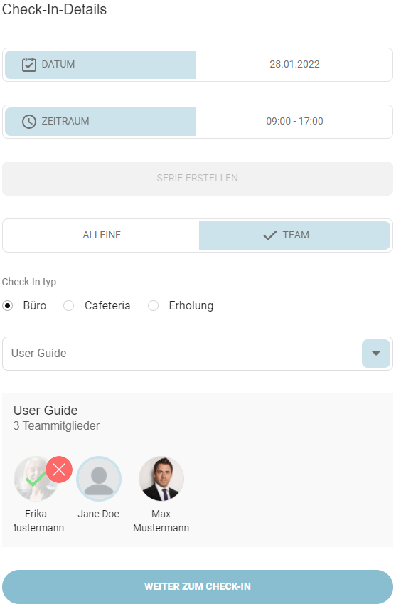 Wenn die/der Benutzerin keine Serie-Check-Ins erstellen möchte, hat sie/er die Möglichkeit, den Check-In entweder allein oder im Team durchzuführen. Die Auswahl des Team-Check-Ins beinhaltet die Auswahl der Art des Check-Ins (Büro, Freizeit oder Cafeteria) und des Teams. Falls die/der Benutzerin mehreren Projektteams angehört, kann sie/er sich über eine Dropdown-Liste alle Teams anzeigen lassen und das gewünschte Team auswählen. Nach der Auswahl des Teams wird eine Liste mit allen Mitgliedern des jeweiligen Teams angezeigt.