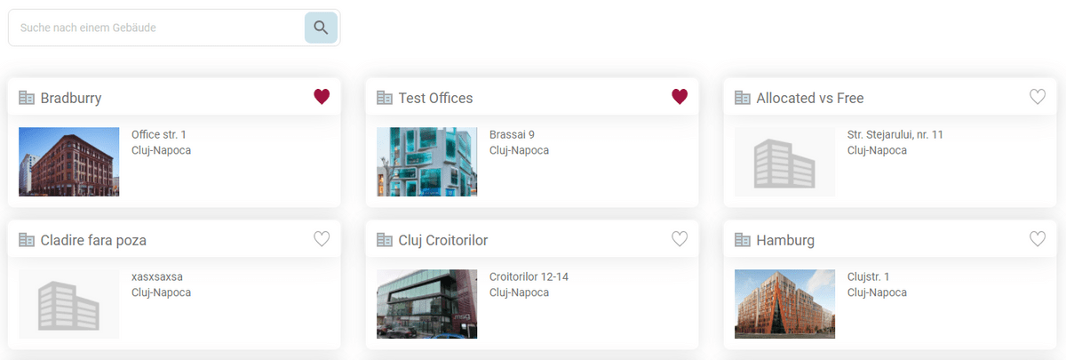 Zuerst muss die/der Benutzer*in das gewünschte Gebäude auswählen. Ein Gebäude kann als Favorit markiert werden, indem auf das Herzsymbol in der rechten oberen Ecke geklickt wird.