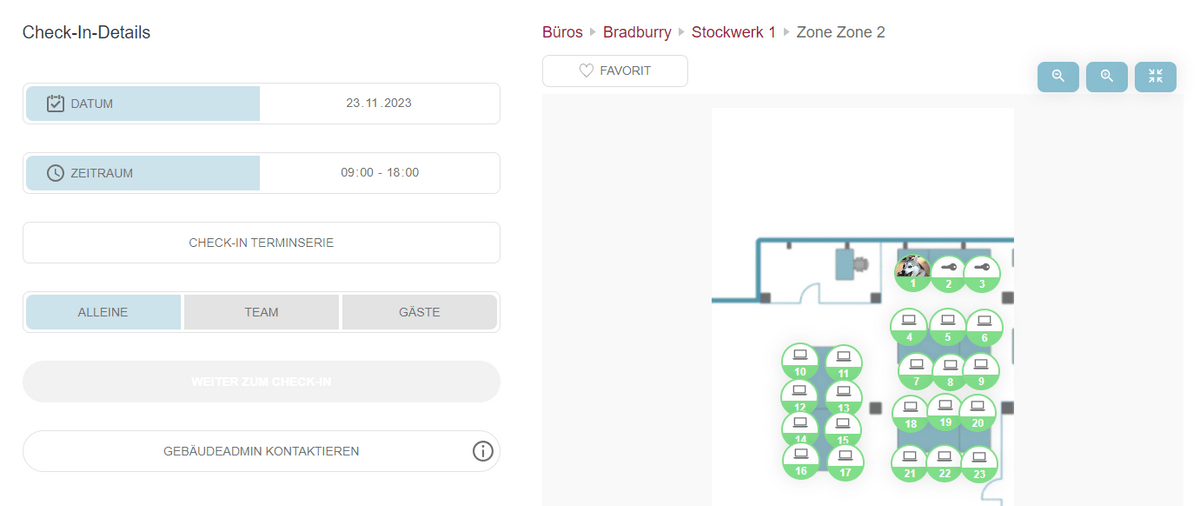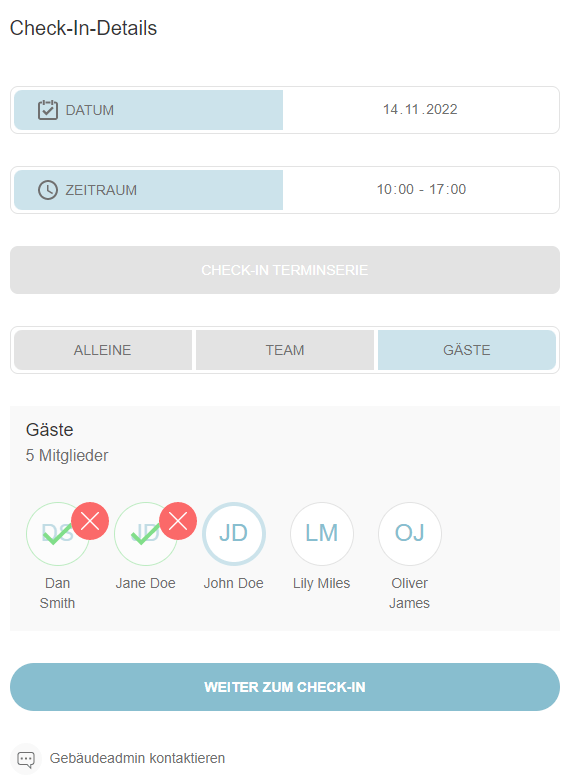Falls die/der Benutzerin die Rolle des Rezeptionsadministrators hat, hat er/sie die Möglichkeit, Check-ins für seine Gäste zu erstellen. Der Ablauf ähnelt dem beim Team-Check-in. Das bedeutet, dass die/der Administrator_in alle erstellten Mitglieder als Teil seines Gast Teams sieht und er/sie die Möglichkeit hat, jedes Mitglied einzeln auf die verfügbaren grünen Stecknadeln aus dem Zonenplan zu setzen.
