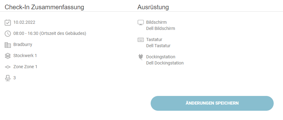 Nach der Auswahl eines Gebäudes, Stockwerks und einer Zone kann die/der Benutzerin dann auf die grünen Schaltflächen klicken, um diesen bestimmten Ort auszuwählen. Sobald ein Arbeitsplatz auf der Karte ausgewählt ist, kann sich die/der Benutzerin die für diesen Arbeitsplatz verfügbare Ausstattung anzeigen lassen.