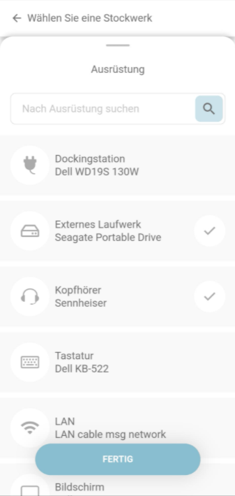 Die/Der Benutzer*in hat die Möglichkeit, die Orte nach einer Reihe von bevorzugten Geräten zu filtern, die diesem Gebäude zugeordnet sind. Durch Klicken auf die Schaltfläche Nach Ausrüstung filtern* kann er/sie zwischen einer oder allen vorhandenen Ausrüstungen auswählen. Dann kann sie/er zu den Stockwerken und Zonen im Gebäude navigieren, an denen die ausgewählte Ausrüstung angeschlossen ist. Darüber hinaus kann die/der Benutzerin im Modul nach einem Gerätetyp oder einem Gerätenamen suchen.