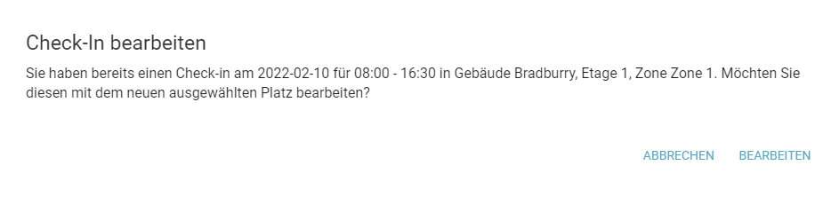 Wenn eine/ein Benutzer*in bereits für das ausgewählte Datum und Zeitintervall eingecheckt ist, wird beim Klicken auf einen anderen Ort das Popup-Fenster zur Eingabe des Bearbeitungs-Check-in-Ablaufs angezeigt: