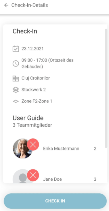 Vor der endgültigen Bestätigung kann die/der Benutzerin die Details seines Check-Ins auf einer Übersichtsseite einsehen. Bei einem Team-Check-In hat die/der Benutzer_in die Möglichkeit, die zuvor ausgewählten Kollegen zu löschen. Wenn die Parkfunktion verfügbar ist und der Check-In im Büro erfolgt, wird nach dem Drücken der Check-In-Schaltfläche ein Bestätigungs-Popup angezeigt, in dem die/der Benutzer*in gefragt wird, ob sie/er mit der Erstellung eines Parkplatz-Check-Ins fortfahren möchte. Der erstellte Check-In wird auf der Startseite unter der Registerkarte _Zukünftige Check-Ins und auf der Seite Kalender unter der Registerkarte Mein Kalender angezeigt.