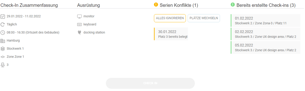 Bei wiederkehrenden Serien-Check-Ins sieht die/der Benutzerin das gewählte Zeitintervall und die Wochentage, an denen sie/er die wiederkehrende Serie erstellen möchte. Wenn nach dem Drücken der Schaltfläche Check-In keine Warnung erscheint, wird auch hier das Erfolgs-Popup angezeigt. Andernfalls wird in der Übersichtsansicht ein neuer Abschnitt angezeigt, genauer gesagt die Plätze, die aufgrund von Belegungsproblemen nicht gebucht werden können. Während dieses Schritts hat die/der Benutzerin die Möglichkeit, diese Plätze zu ändern, indem sie/er auf die Schaltfläche Plätze ändern klickt, oder er/sie kann sie ignorieren, indem er auf die Schaltfläche Alle ignorieren klickt.