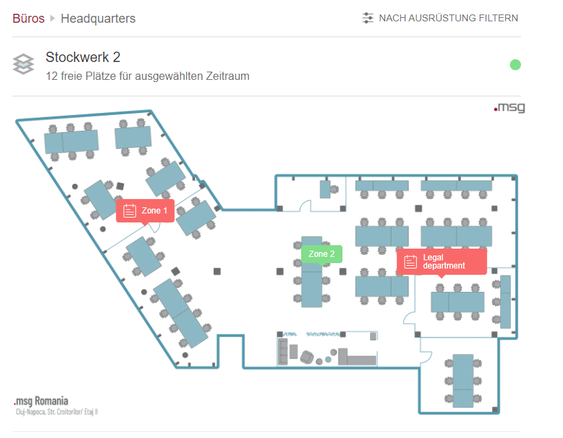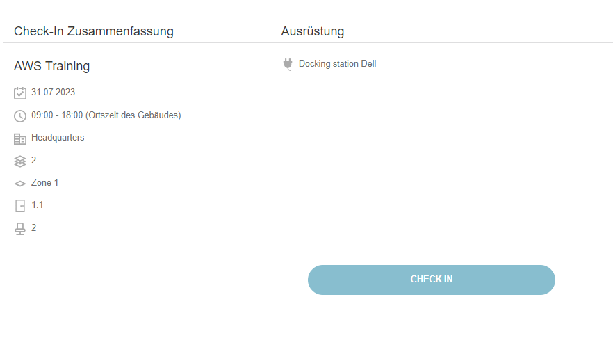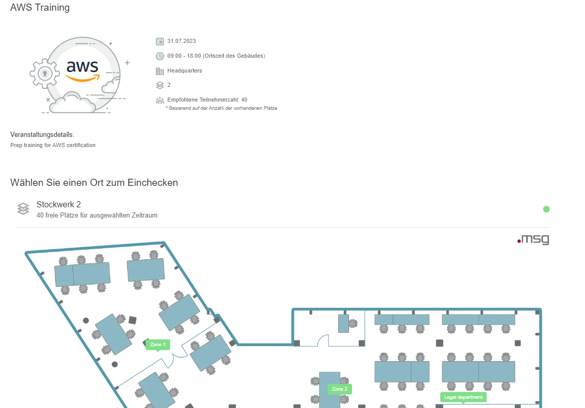 Für Veranstaltungen außerhalb der Unternehmensgebäude müssen Benutzer keinen Platz auf der Zonenkarte auswählen. Stattdessen sichert das Klicken auf die Schaltfläche "Anmelden" ihren Platz bei der Veranstaltung.