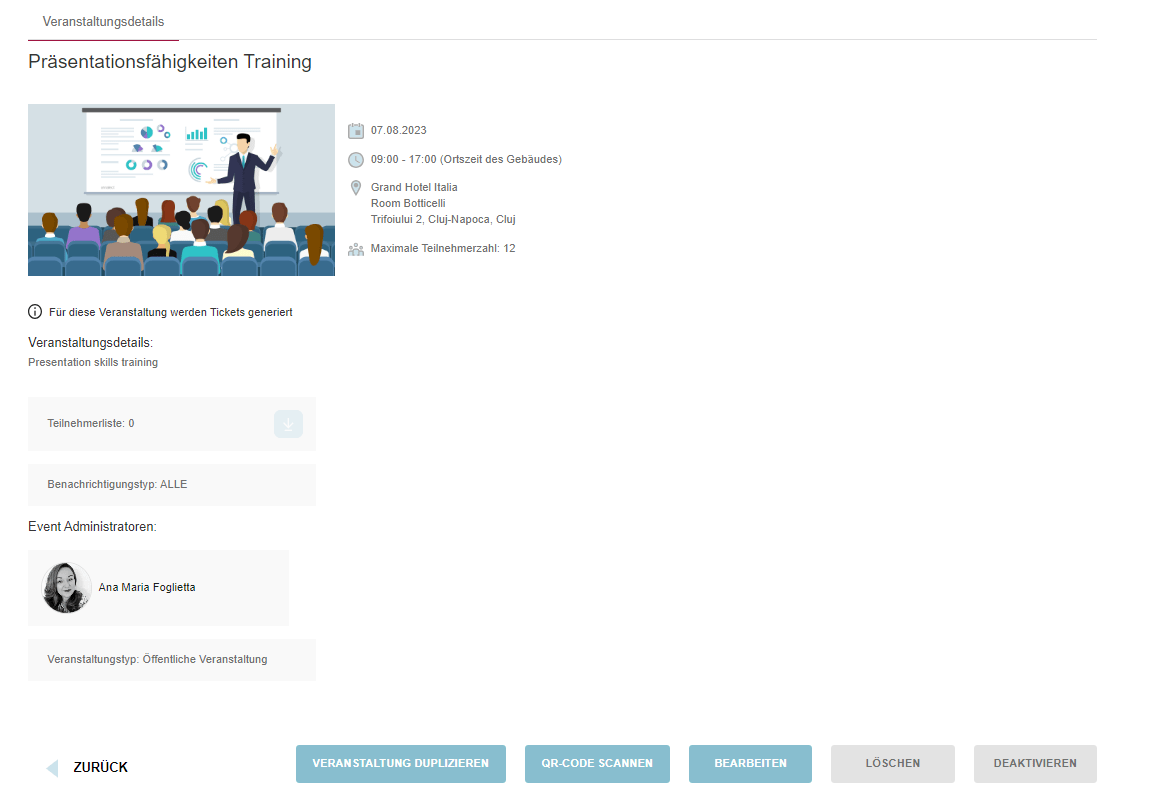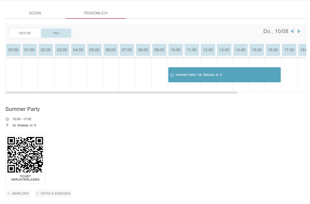 Nach Abschluss des Registrierungsprozesses, falls die Veranstaltung eine Ticketgenerierung erfordert, erhalten die Nutzer auf der Kalenderseite Zugriff auf den speziell für die Veranstaltung generierte QR-Code.