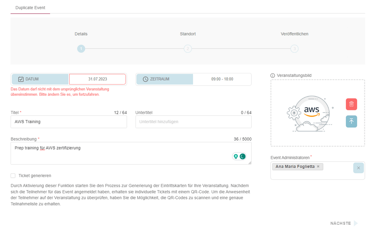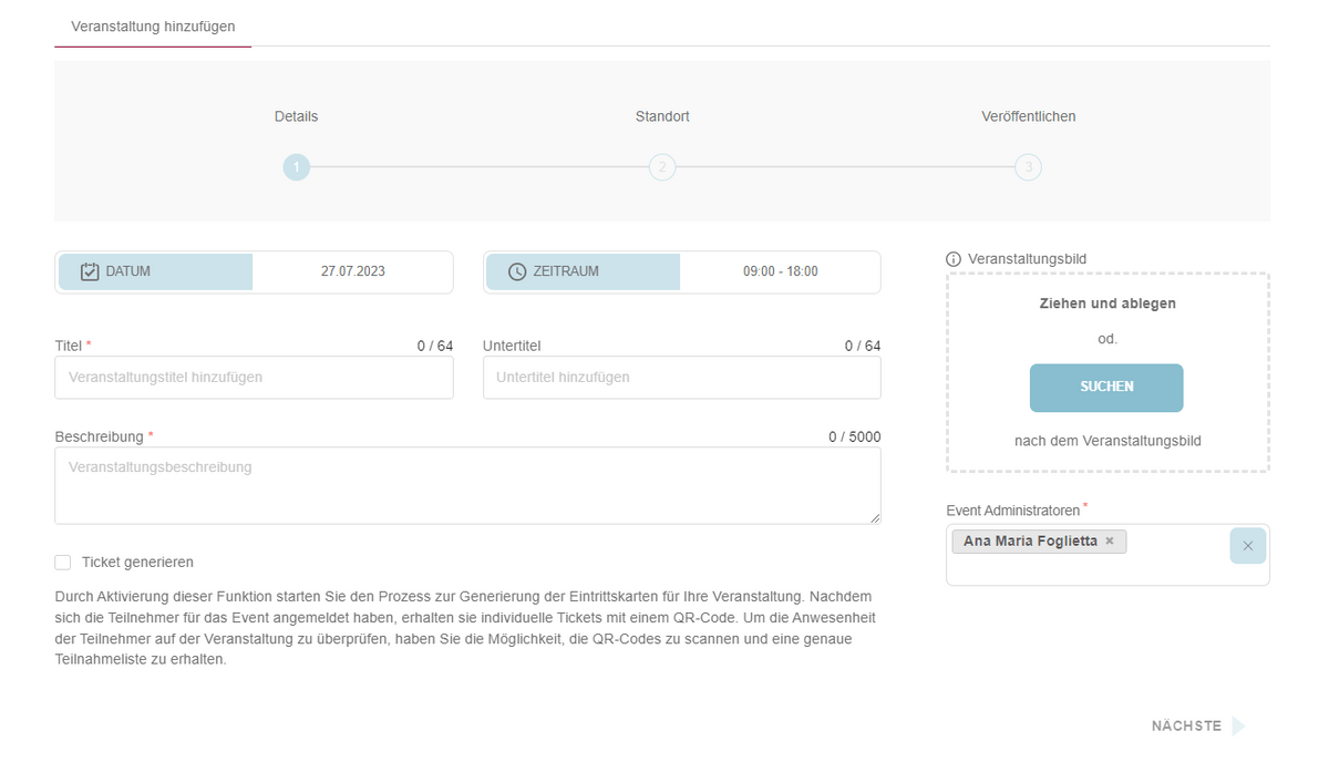 Sobald alle erforderlichen Felder ausgefüllt sind, wird die Schaltfläche "Weiter" aktiviert, sodass der Benutzer zum zweiten Schritt der Veranstaltungserstellung fortschreiten kann.