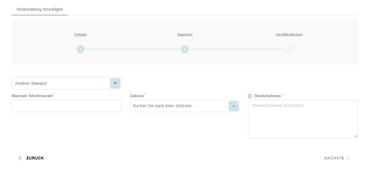 Alle drei Felder sind Pflichtfelder und müssen vom Veranstaltungsplaner ausgefüllt werden, um zum dritten Schritt zu gelangen.
