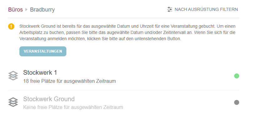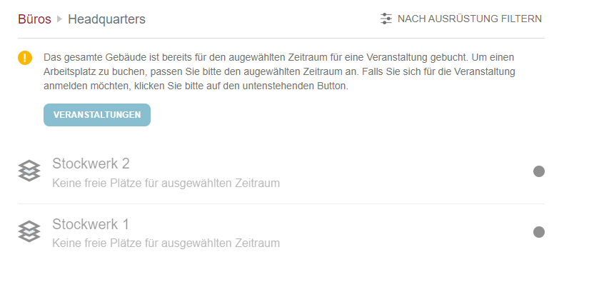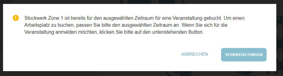 Das Veranstaltungsfeature hat auch Auswirkungen auf den Check-in-Prozess im Büro. Benutzer können in Gebäuden, Stockwerke oder Zonen, die für Veranstaltungen reserviert sind, keinen Büro-Check-in erstellen, und es werden Warnmeldungen angezeigt. Benutzer können entweder ein anderes Gebäude/Etage oder eine andere Zone auswählen oder sich für die Veranstaltung anmelden, indem sie auf die Schaltfläche "Veranstaltungen" klicken.