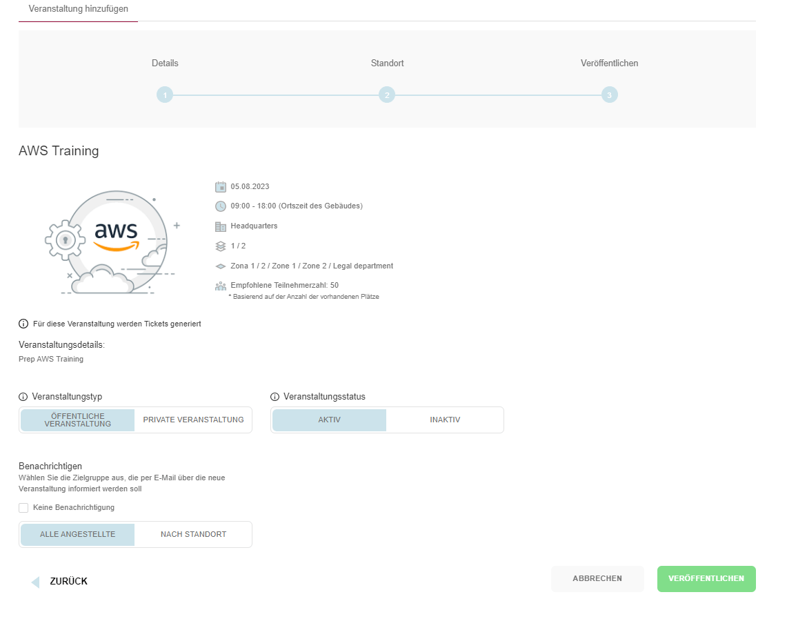 Durch Drücken der Schaltfläche "+ Veranstaltung hinzufügen" wird der Erstellungsprozess für die Veranstaltung gestartet. Dieser Prozess besteht aus drei Schritten: Angabe der Details, Festlegung des Veranstaltungsortes und Veröffentlichung.