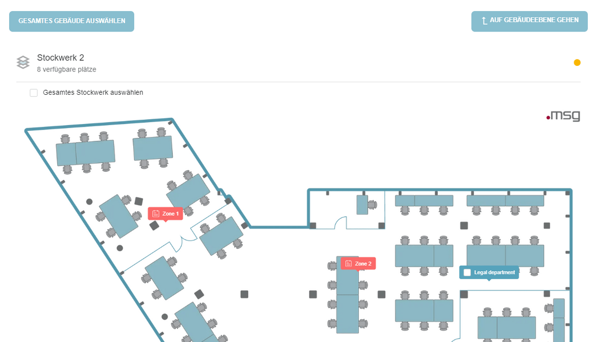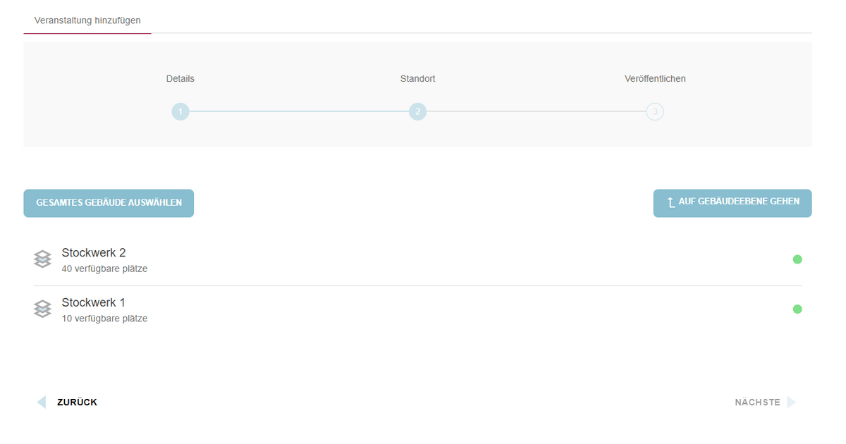 Wenn mehrere Gebäude verfügbar sind, beginnt die Auswahl auf der Gebäudeebene. Ein Veranstaltungsplaner kann ein Gebäude auswählen und dann auswählen, welche Stockwercke und/oder Zonen er/sie für die Veranstaltung buchen möchte. Wenn der Veranstaltungsplaner das gesamte Gebäude buchen möchte, kann er/sie einfach auf die Schaltfläche "Gesamtes Gebäude auswählen" klicken, die sich in der oberen linken Ecke der ausgewählten Gebäudekarte befindet. Die Schaltfläche "Auf Gebäudeebene gehen" ermöglicht es dem Benutzer, zur Gebäudeauswahlebene zurückzukehren.