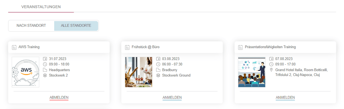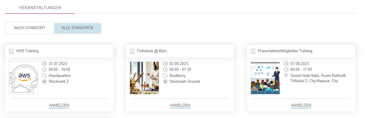 Durch Anklicken einer Karte erhalten Sie zusätzliche Informationen, einschließlich der empfohlenen Anzahl der Teilnehmer und einer umfassenden Veranstaltungsbeschreibung. Um sich für eine Veranstaltung anzumelden, können Benutzer auf die Schaltfläche "Anmelden" auf der Karte oder den angezeigten Details klicken, die zur Seite "Veranstaltungsdetails" führen. Diese Seite enthält wichtige Veranstaltungsinformationen und einen Abschnitt "Wählen Sie einen Ort zum Einchecken", um sich auf die gleiche Weise wie bei Büro-Check-ins im Gebäude zu navigieren und zu registrieren.