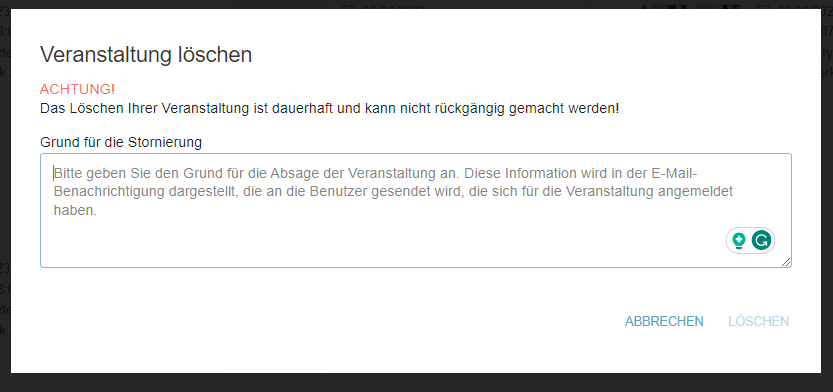 Um eine Veranstaltung von der Seite der kommenden Veranstaltungen zu entfernen, können Veranstaltungsplaner die Schaltfläche "Papierkorb" auf der Karte verwenden oder auf der Vorschauseite der spezifischen Veranstaltung die Schaltfläche "Löschen" drücken. Beim Löschen wird ein Modal angezeigt, das um den Grund für die Entfernung der Veranstaltung bittet. Die Angabe eines Grundes ist obligatorisch, da er in Benachrichtigungen an alle Benutzer aufgenommen wird, die sich für die Veranstaltung registriert haben, um sie über die Löschung der Veranstaltung zu informieren.