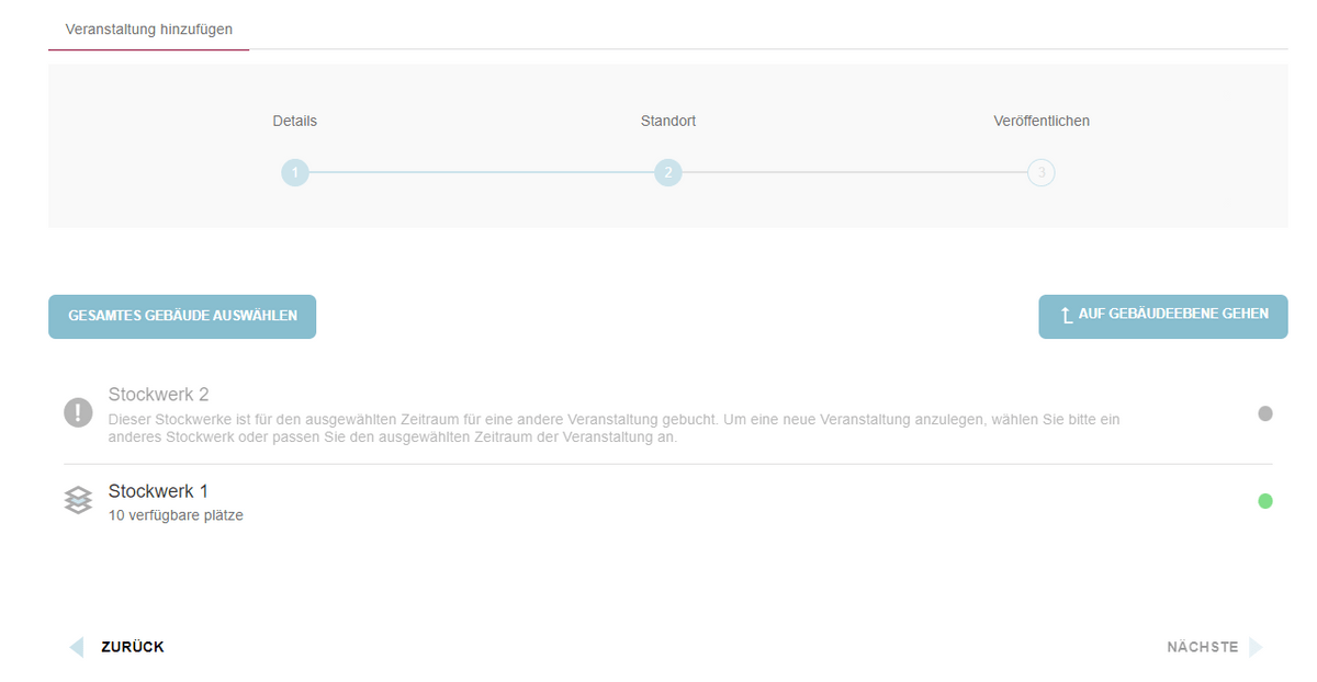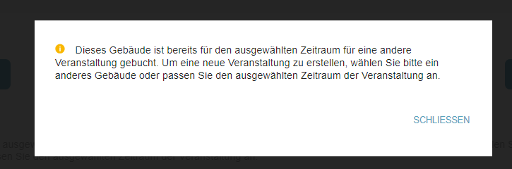Dieser Schritt ist besonders wichtig im Veranstaltungserstellungsprozess, da Veranstaltungen sich nicht für dasselbe Datum, dieselbe Uhrzeit und denselben Ort überschneiden können. Wenn Gebäude, Etagen oder Räume bereits für die angegebenen Details gebucht sind, erhält der Benutzer Pop-up-Benachrichtigungen oder Warnmeldungen, die anzeigen, dass eine Buchung nicht möglich ist: