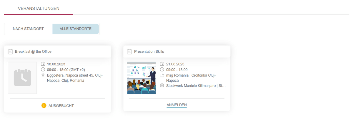 Unter der Registerkarte "Veranstaltungen" können Benutzer kommende Veranstaltungen in Form von Karten anzeigen. Jede Karte zeigt wichtige Veranstaltungsdetails wie Titel, Datum, Uhrzeit und Ort an. Eine Schaltfläche in der oberen linken Ecke ermöglicht es Benutzern, Veranstaltungen nach Standort zu filtern oder alle verfügbaren Veranstaltungen anzuzeigen.