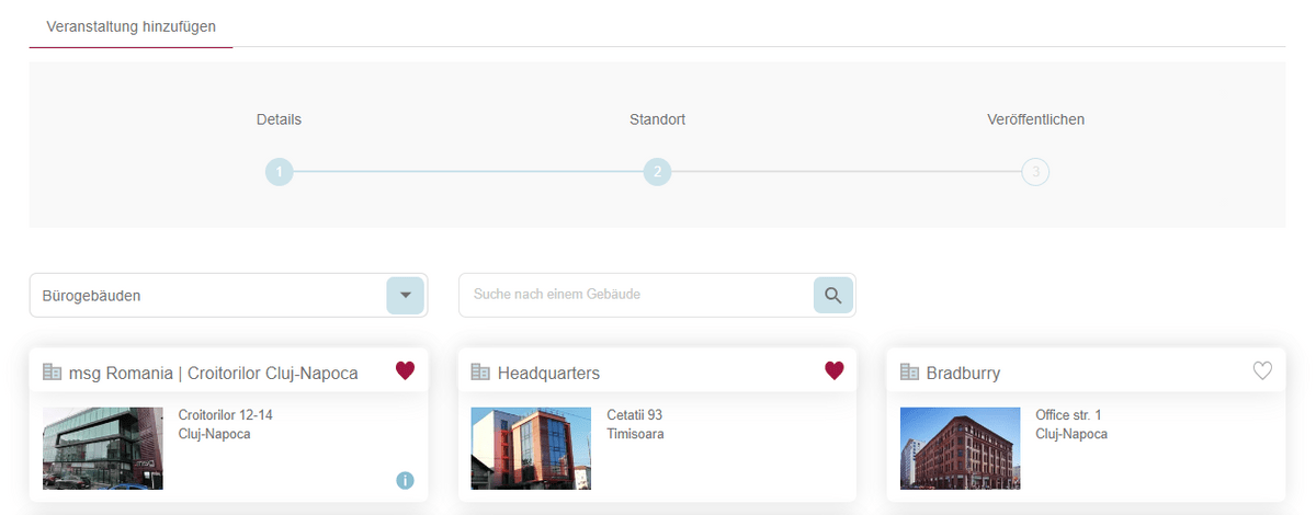 Der zweite Schritt repräsentiert die Standortauswahl. Der Veranstaltungsplaner hat die Möglichkeit, entweder ein bestehendes Gebäude auszuwählen oder die Veranstaltung an einem anderen Ort außerhalb des Unternehmens zu erstellen. Standardmäßig ist die Option "Bürogebäuden" ausgewählt, was bedeutet, dass die Möglichkeit besteht, eine Veranstaltung innerhalb eines bestehenden Bürokomplexes zu erstellen. Das Dropdown-Menü bietet auch die Auswahlmöglichkeit "Anderer Standorte" für den Veranstaltungstyp.