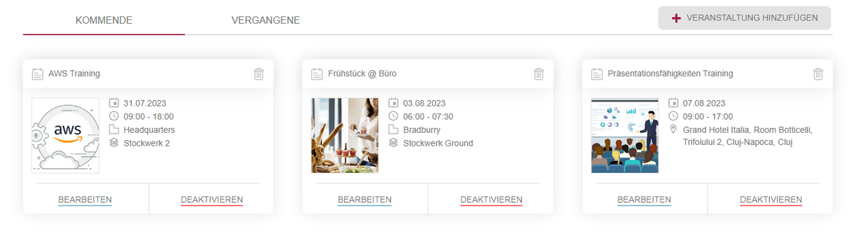 Benutzer mit der Rolle "Veranstaltungsplaner" haben Zugriff auf ein Dropdown-Menü auf der Registerkarte Veranstaltungen. Beim Zugriff auf die Registerkarte "Veranstaltungen verwalten" werden die kommenden Veranstaltungen in Form von Karten mit den relevantesten Details angezeigt. Zusätzlich zu den Details befinden sich auf der Karte Verknüpfungsschaltflächen für Aktionen wie Bearbeiten, Aktivieren/Deaktivieren und Löschen. In der oberen linken Ecke der Seite, unterhalb des Menüs, ermöglicht ein Navigations-Tab-Komponente dem Benutzer den Zugriff auf die Seite Vergangene Veranstaltungen. Diese Seite stellt ein Archiv aller vergangenen Veranstaltungen des Unternehmens dar, ebenfalls in Form von Karten mit Details, aber ohne Verknüpfungsschaltflächen und mögliche Aktionen. Vergangene Veranstaltungen können nicht gelöscht werden und können nur für Details eingesehen werden.