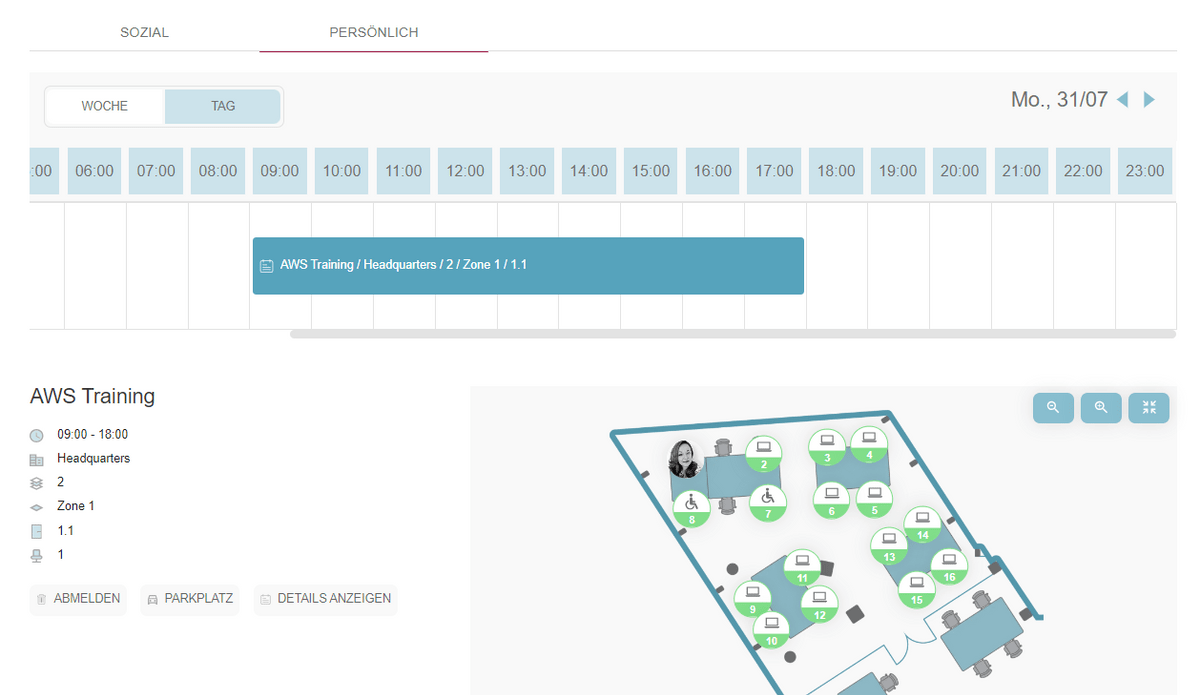 Nach der Registrierung für eine Veranstaltung erscheint der Eintrag im persönlichen Kalender des Benutzers, zusammen mit verfügbaren Aktionen wie Abmelden, Details Anzeigen und Hinzufügen eines Parkplatzes (falls dies während der Registrierung nicht erfolgt ist). Ein spezielles Veranstaltungssymbol unterscheidet die Veranstaltung von normalen Büro-Check-ins im persönlichen Kalenderbereich des Benutzers.