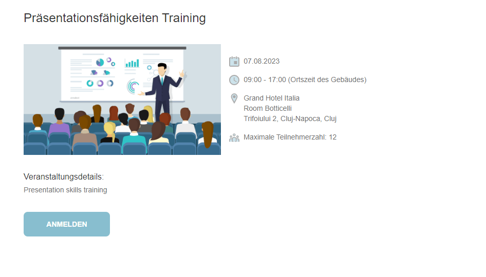 Wenn Sie weitere Informationen zu einer bestimmten Veranstaltung wünschen, können Sie auf die Karte klicken, um sie zu öffnen. Hier finden Sie Informationen über die empfohlene Anzahl der Teilnehmer, eine ausführliche Beschreibung der Veranstaltung und andere wichtige Informationen.