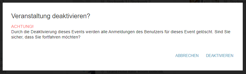 Das Deaktivieren einer Veranstaltung löscht alle bestehenden Registrierungen, und die Benutzer werden entsprechend benachrichtigt. Nach der Deaktivierung wird die Veranstaltung für Endbenutzer nicht mehr sichtbar sein, bleibt jedoch für den Veranstaltungsplaner zugänglich. Wenn es möglich ist, dass die Veranstaltung zu einem späteren Zeitpunkt stattfinden kann, ist es besser, sie zu deaktivieren, anstatt sie zu löschen, da alle Daten über die Veranstaltung gespeichert bleiben.
