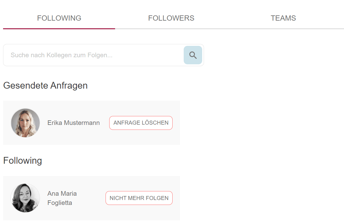 Nachdem Sie eine Follower-Anfrage von einem Ihrer Kolleg*innen angenommen haben und diese/r Benutzerin noch nicht Teil Ihrer Follower-Liste ist, wird neben den Namen der/s Benutzersin eine Schaltfläche Auch Folgen* angezeigt. Durch Drücken des Auch Folgen Buttons wird eine Follow-Anfrage an diese/n Benutzerin gesendet. Sobald auf die Schaltfläche geklickt wird, verschwindet sie und die Folgeanfrage und Benachrichtigung über diese Aktion wird an die/den Benutzerin gesendet. Um sie anzusehen, können Sie zur Registerkarte Following zurückkehren und die Anfrage unter Gesendete Anfragen* sehen.