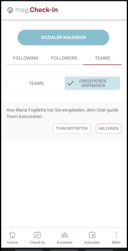 Alle verfügbaren eingehenden Anfragen werden im oberen Bereich der Seite mit zwei Aktionsschaltflächen angezeigt: Team beitreten und Ablehnen.