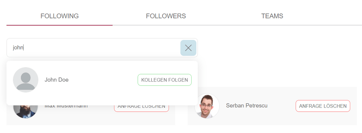 Gehen Sie auf der Kontakte-Seite zur Registerkarte Following, um einer/einem Kollegenin zu folgen. Suchen Sie hier nach der Person, der Sie folgen möchten und drücken Sie die Schaltfläche Kollegen folgen. Die/der jeweilige Kollegein wird über die Anfrage benachrichtigt und hat dann die Möglichkeit, diese anzunehmen oder abzulehnen
