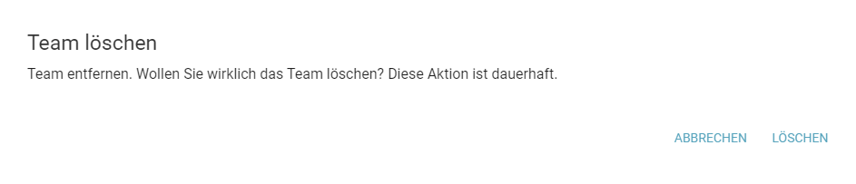 Um ein ganzes Team zu löschen, sollte die dem Team entsprechende Schaltfläche Team löschen verwendet werden. Diese Funktion ist nur für die/den Ersteller*in des jeweiligen Teams verfügbar. Nach Bestätigung der Löschung wird das Team vollständig aus dem System entfernt und alle Benutzer, die die Beitrittsanfrage akzeptiert haben, werden nun über die Löschung benachrichtigt.