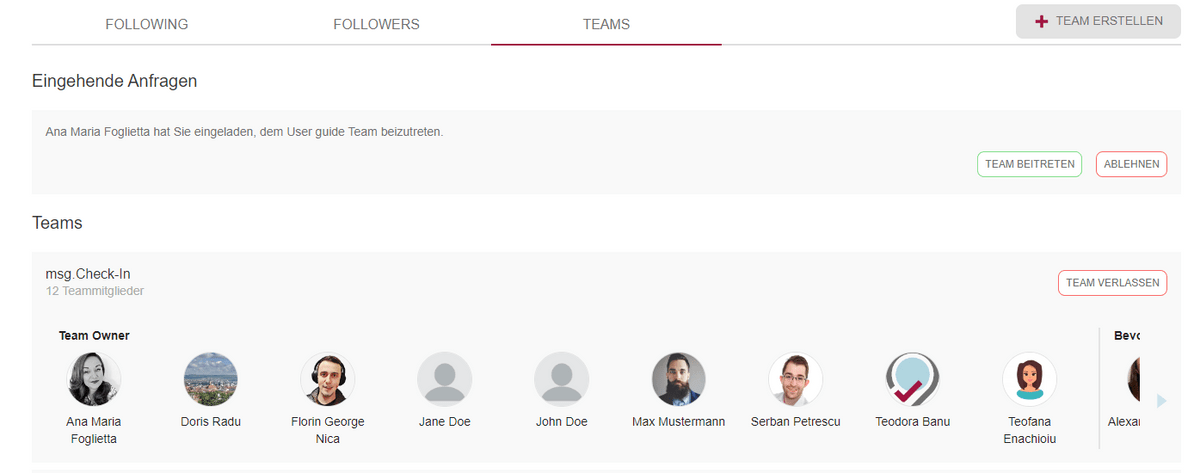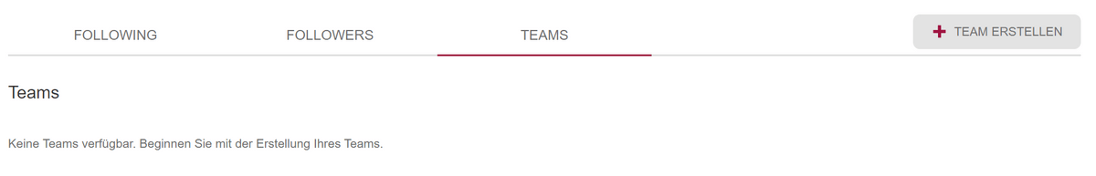 Der Kontakte-Bereich ist in drei Registerkarten unterteilt: Following, Followers und Teams.