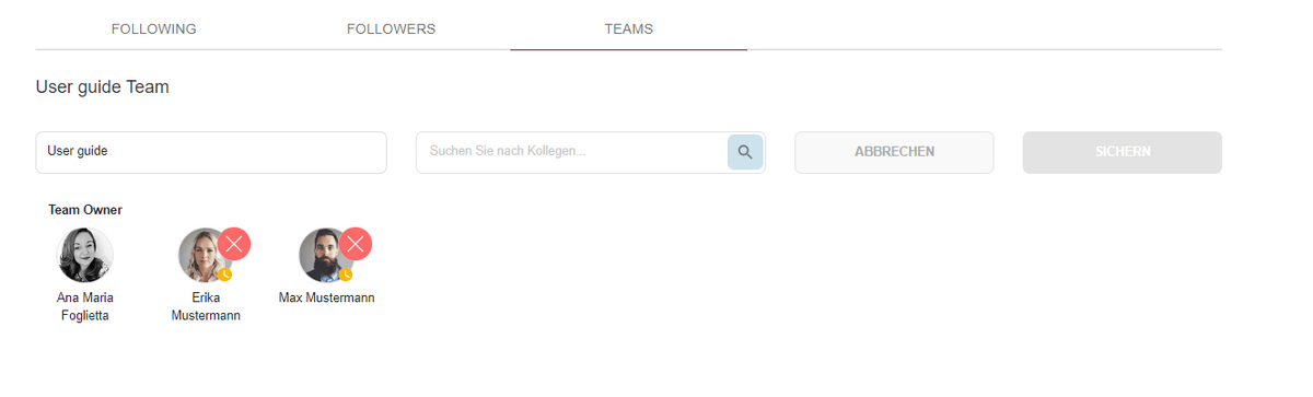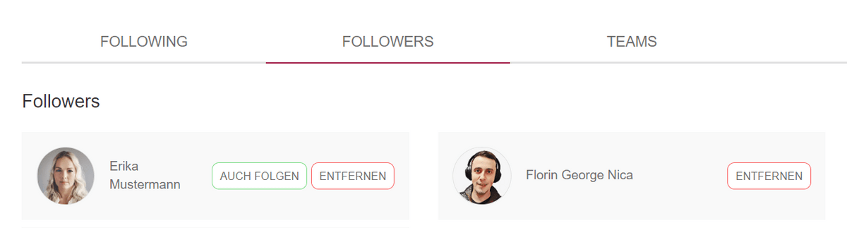Die/der Benutzerin kann auch die zuvor bestätigten Followers entfernen, indem er/sie auf die Schaltfläche Entfernen neben dem entsprechenden Foto klickt. Sobald ein/eine Benutzerin aus der Liste entfernt wird, wird diese/r Kollege*in ebenfalls über diese Aktion benachrichtigt