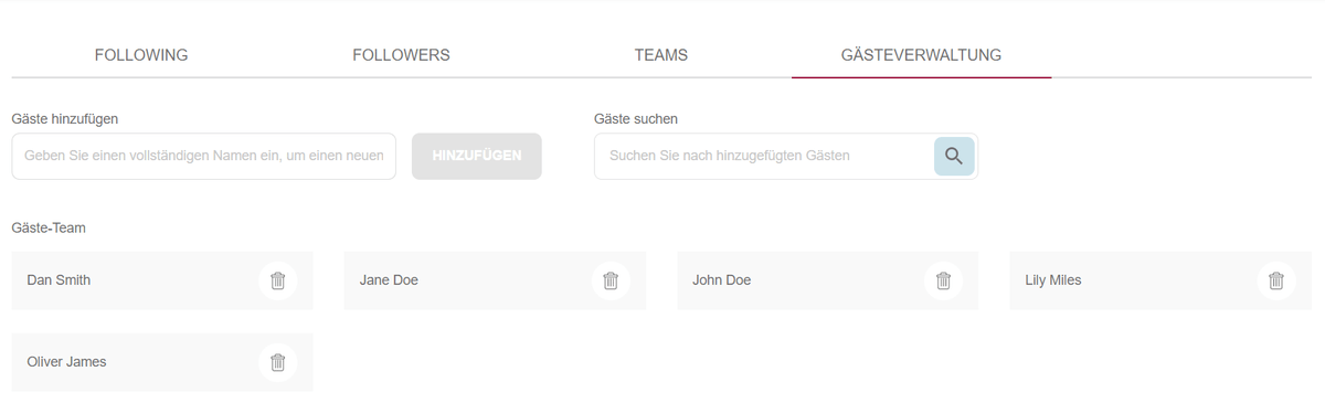 Falls der Benutzer die Rolle des Rezeptionsadministrators hat, wird ihm eine neue Registerkarte namens Gästeverwaltung unter Kontakte angezeigt. In diesem Abschnitt kann der Benutzer Gäste hinzufügen, indem er deren vollständigen Namen in das Eingabefeld eingibt und auf die Schaltfläche „Hinzufügen“ klickt. Außerdem kann der Benutzer nach dem Namen eines Gastes suchen oder einen Eintrag löschen. Alle hinzugefügten Gäste bilden das Gästeteam des Benutzers. Falls der Rezeptionsadministrator während des Prozesses „Mitglieder verwalten“ eines bereits erstellten Check-ins neue Gäste hinzufügt, werden deren Namen ebenfalls in diesem Abschnitt angezeigt.
