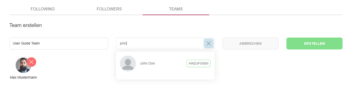 Die Schaltfläche Team erstellen öffnet die Ansicht zur Teamerstellung, in der die Informationen Teamname und Teammitglieder hinzugefügt werden können. Der Teamname muss in der Anwendung einmalig sein. Falls ein anderes Team mit demselben Namen verfügbar ist, kann das neu hinzugefügte Team nicht gespeichert werden. Um Mitglieder zum Team hinzuzufügen, müssen die Namen der Kollegen in das Suchfeld eingegeben und die Schaltfläche Hinzufügen gedrückt werden.