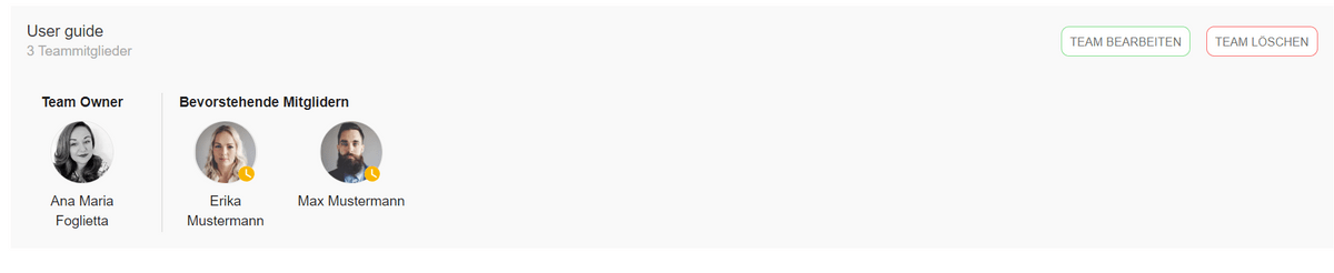 Die neu hinzugefügten Mitglieder haben nun den Status "bevorstehend", gekennzeichnet durch den Text „Bevorstehende Mitglieder“ und das gelbe Uhrensymbol, das an jedem Benutzerbild angebracht ist. Sie bleiben ausstehende Teammitglieder, was bedeutet, dass sie noch nicht Teil des Teams sind, bis sie die Anfrage zum Beitritt zum Team annehmen. Sobald die Anfrage akzeptiert wurde, haben sie nicht mehr den Status bevorstehend und können nun während des Team-Check-in-Prozesses eingecheckt werden. Solange der Status ausstehend bleibt, sind diese beim Erstellen eines Team-Check-ins nicht verfügbar. Wenn die Einladung abgelehnt wird, wird die/der Benutzer*in aus dem Team entfernt und ihre/seine Informationen sind nicht mehr sichtbar.