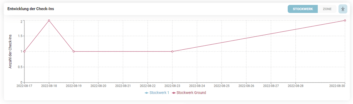 In diesem Diagramm kann die/der Benutzer*in die Anzahl der validierten Check-Ins im Laufe der Zeit für eine bestimmte Zone oder Etage sehen: