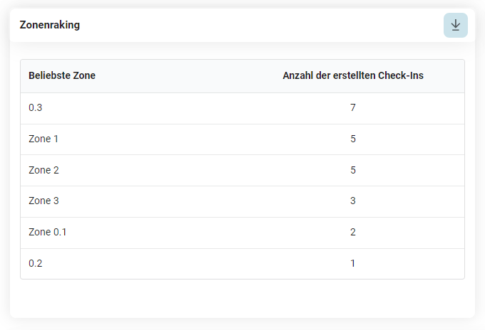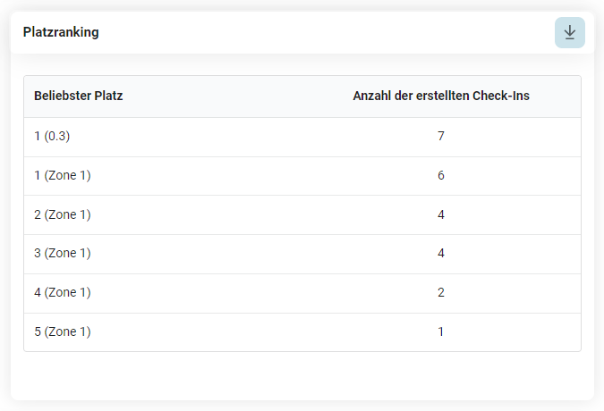 In dieser Tabelle kann die/der Benutzer*in sehen, welche die beliebtesten Orte des ausgewählten Gebäudes sind, unter Berücksichtigung der validierten Check-Ins. Die ersten 6 beliebtesten Orte werden in der Tabelle angezeigt: