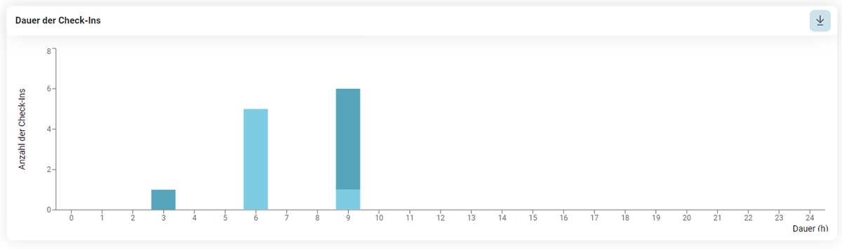 Die Balken des Diagramms sind in zwei Abschnitte unterteilt: Der erste zeigt die Anzahl der erstellten Check-Ins und der zweite die Anzahl der validierten Check-Ins für die Gesamtzahl der während dieser Dauer erstellten Check-Ins.
