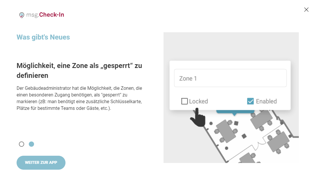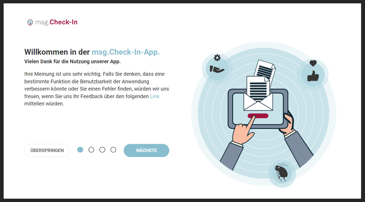Für die Mitarbeiter*innen, die sich zum ersten Mal in die msg.Check-In-App einloggen, wird ein "Willkommensbildschirm" angezeigt. Dieser wird auch nach einem Login angezeigt, falls es zu Änderungen in der App gekommen ist.