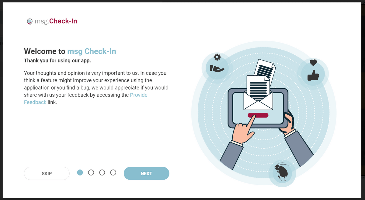 For the employees who first log into the msg.Check-In app, a "Welcome screen" will be displayed, and in the case, something changes, one or more screens depicting that will be displayed after login, as you can read below.