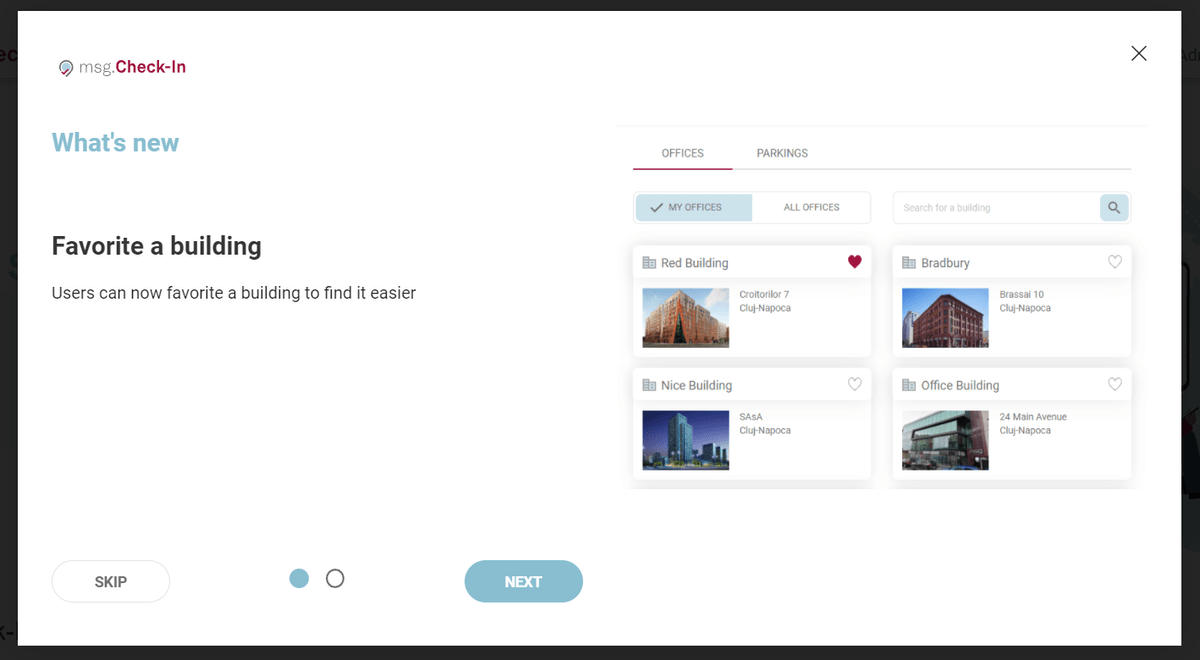 What's New Screen - The users will be informed every time changes appear in the application. The user can read the news and navigate between them using the little circles or the Next button. News can be ignored by pressing either the Skip button or the Continue to app button or by pressing the X icon at the top right of the dialog box.