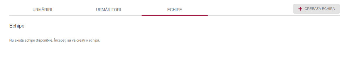În tabul Echipe din secțiunea Comunitate sunt afișate toate echipele din care faceți dvs. parte. Acestea pot fi, fie echipe create de dvs. (opțiunile Editare și Ștergere sunt activate), fie echipe în care ați fost adăugat de alți colegi (opțiunea Părăsiți echipa activă). Există de asemenea opțiunea de a crea o nouă echipă prin simpla apăsare a butonului + Creează echipă.