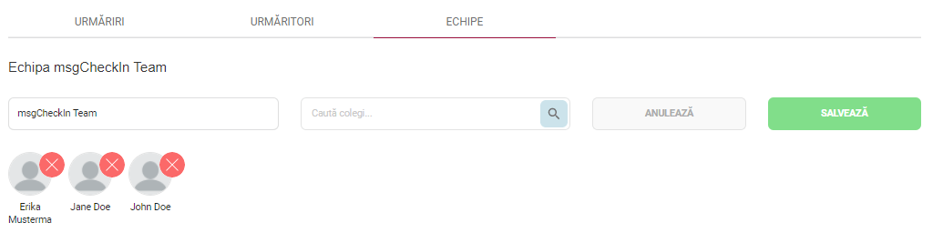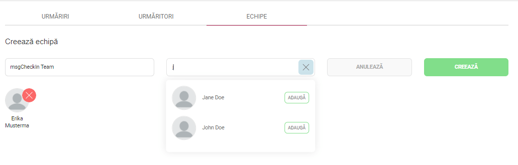 Butonul Creează echipă deschide pagina de creare a echipei în care pot fi adăugate următoarele informații: Numele echipei și Membrii echipei. Numele echipei trebuie să fie unic în aplicație. În cazul în care există o altă echipă disponibilă cu același nume, noua echipă adăugată nu poate fi salvată. Pentru a adăuga membri în echipă, numele colegilor trebuie introduse în câmpul de căutare și trebuie apăsat butonul Adaugă.