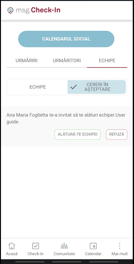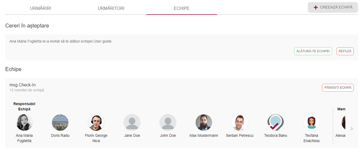 Odată apăsat butonul Creează, echipa este creată și afișată în tab-ul Echipe. Noii membri adăugați vor fi acum în așteptare, stare marcată prin textul „Membri în așteptare” și prin simbolul ceasului galben atașat în dreptul fiecărui utilizator. Ei vor rămâne membri în așteptare, adică nu fac încă parte din echipă, până când acceptă cererea de a se alătura echipei. Odată ce cererea este acceptată, aceștia nu vor mai avea statutul în așteptare, iar de asemenea de acum încolo pot fi înregistrați în timpul procesului de check-in în echipă. Atâta timp cât rămân în starea de așteptare, numele lor nu va fi disponibil la crearea unui check-in de echipă. Dacă invitația de alăturare la echipă este refuzată, atunci utilizatorul este eliminat din echipă și informațiile sale nu mai sunt vizibile.