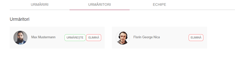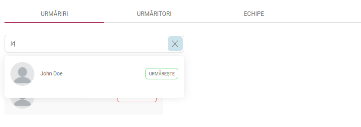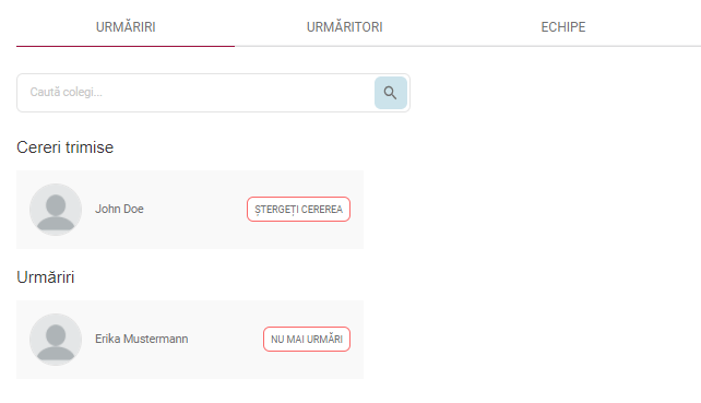 După ce ați acceptat o solicitare de urmărire din partea unuia dintre colegii dvs., dacă acel utilizator nu face încă parte din lista dvs. de urmăriri, atunci vă v-a apărea un buton numit „Urmărește” pe cardul utilizatorului. Prin apăsarea butonului de urmărire, este declanșată o solicitare de urmărire a utilizatorului respectiv. Odată apăsat butonul, acesta dispare iar solicitarea, precum și notificarea de urmărire sunt trimise utilizatorului. Pentru a vizualiza această solicitare, puteți reveni la tab-ul Urmăriri și puteți vedea cererea în secțiunea Cereri trimise.